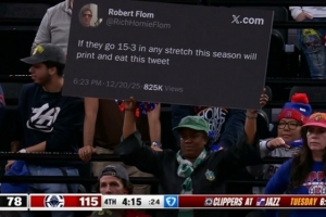 GIF-有球迷当时发推特说快船要打出15胜3负就把这条推特打印出来吃掉,这条被场边球迷打印出来了