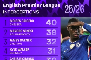 本赛季英超拦截次数排名: