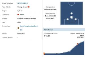 体育资讯01月29日讯 德转更新徐彬信息,他已经成为狼队U21球员。