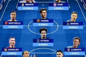 体育资讯1月29日讯 欧冠联赛阶段战罢,德转也盘点了本赛季进球最多11人阵容,具体如下: