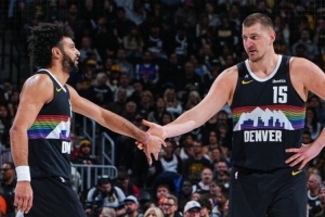 赛后球队发布赢球海报,约基奇和穆雷二人组登上封面。