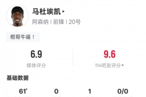 体育资讯2月1日讯 英超第24轮,阿森纳客战利兹联,马杜埃凯首发出战,送出1次助攻,2次关键传球,1次过人成功,评分6.9。