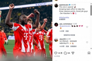 赛后拜仁后卫于帕梅卡诺在社媒晒出球队庆祝胜利的照片,配文写道:“这场胜利尤为珍贵,全队付出不懈的努力收获重要的三分!大家漂亮的完成任务!国家德比胜利属于拜仁!”