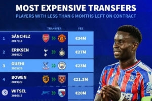 合同不到半年卖人最贵榜:桑切斯3400万居首 埃里克森、格伊列二三