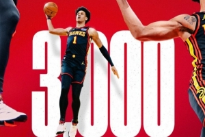 杰伦·约翰逊常规赛生涯总得分突破3000大关。